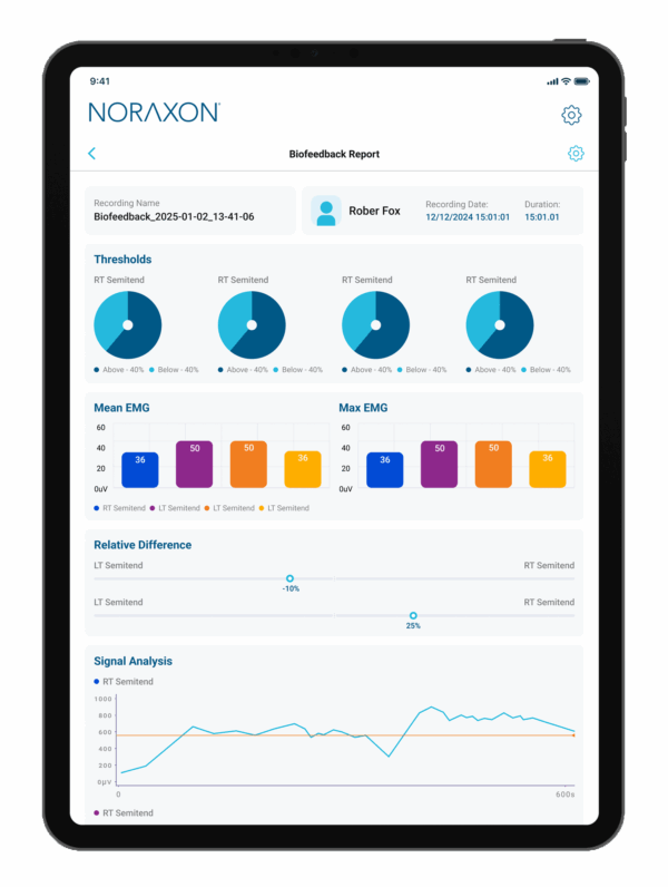Noraxon EMG-Biofeedback unterstützt nachweislich das motorische Lernen und das Bewusstsein der Patienten für korrekte Muskelkontraktionen. Die Rückmeldung in Echtzeit beschleunigt den Therapieerfolg und steigert die Motivation, da Patienten ihre Fortschritte direkt beobachten können. Mit den konfigurierbaren Biofeedback-Protokollen von Noraxon – einschließlich visueller und akustischer Signale – lassen sich Sensibilität und muskuläre Kontrolle gezielt trainieren. Anpassbare Reportoptionen ermöglichen die objektive Dokumentation des Therapieverlaufs und liefern fundierte Grundlage für die Anpassung von Trainingsprogrammen.